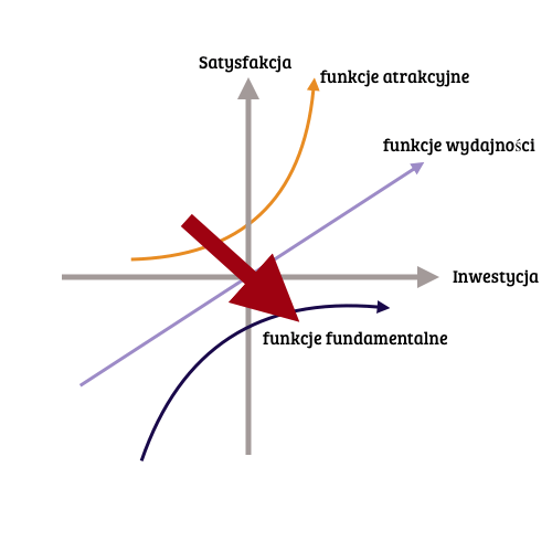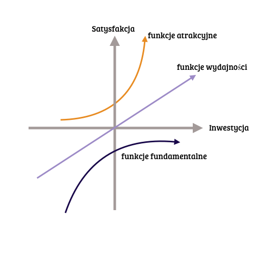 W przypadku nowego produktu liczba funkcji fundamentalnych będzie z całą pewnością przeważała nad resztą. W miarę rozwoju aplikacji rozwijane będą głównie funkcje wydajności. Nie możesz zapominać także o funkcjach atrakcyjnych z perspektywy użytkownika. To właśnie te ostatnie spowodują największy wzrost poziomu satysfakcji. Unikaj jednak funkcji obojętnych.